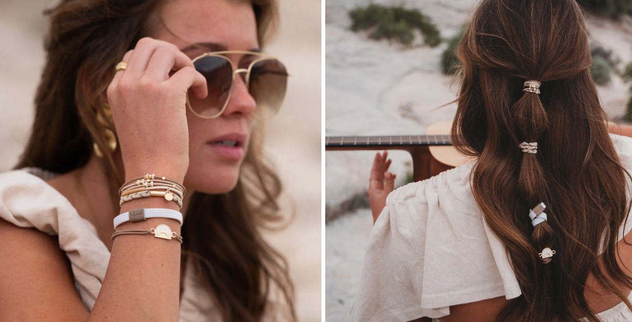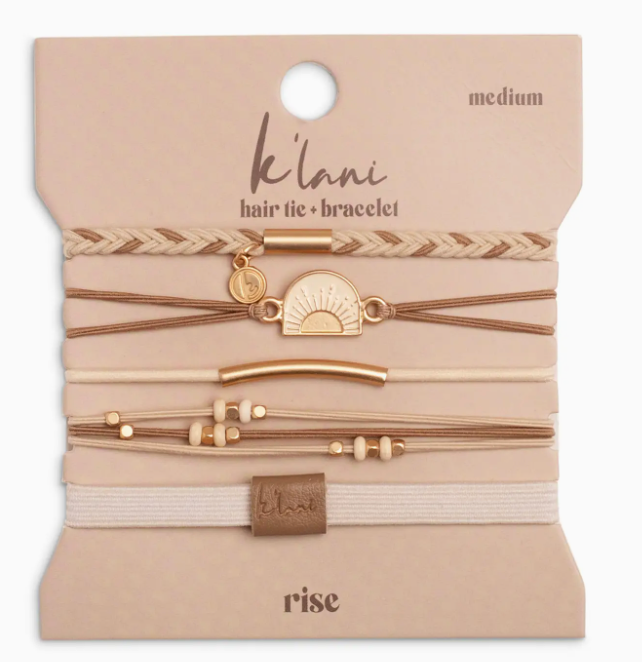 Rise Our Rise set includes five bracelets that double as hair ties in warm neutrals and gold and cream accents that will go with any outfit. The sunrise charm reminds us to rise up and shine every moment.